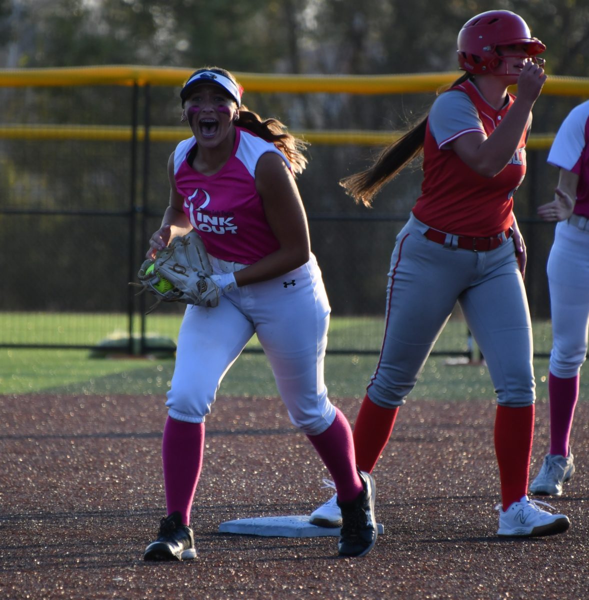 Fired Up… Lady Eagle shortstop Bobbie Diibon celebrates after making a tag for an out on a Lady Trojan steal attempt during Holden’s home conference against Carrollton on Thursday, Oct. 10. Photo by Steve Edwards